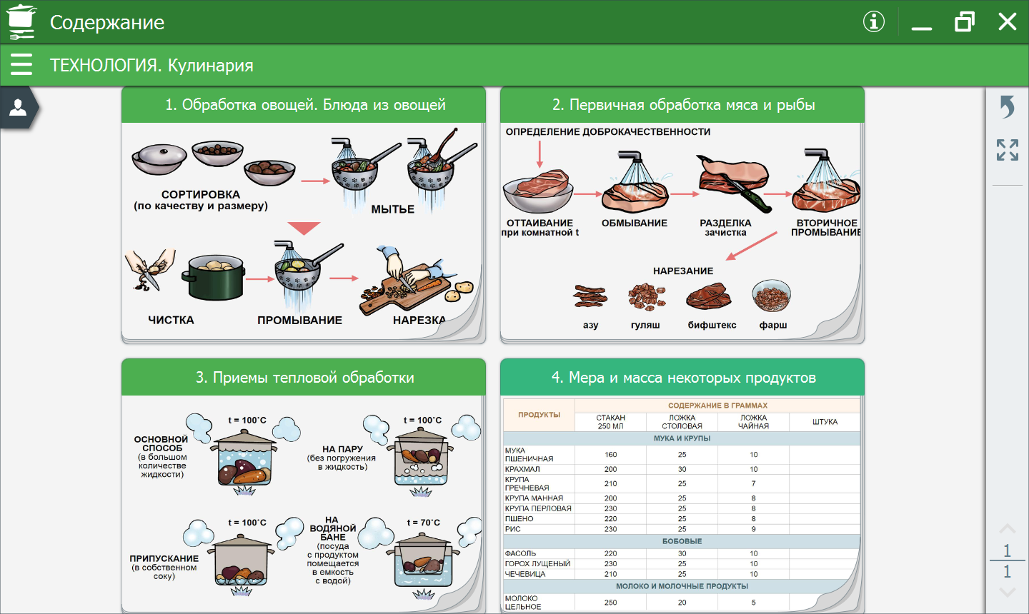 Отличительной особенностью интерактивных учебных пособий «ТЕХНОЛОГИЯ. Кулинария» является создание собственной тематической последовательности курса с возможностью включить дополнительные медиаобъекты в структуру самого пособия.