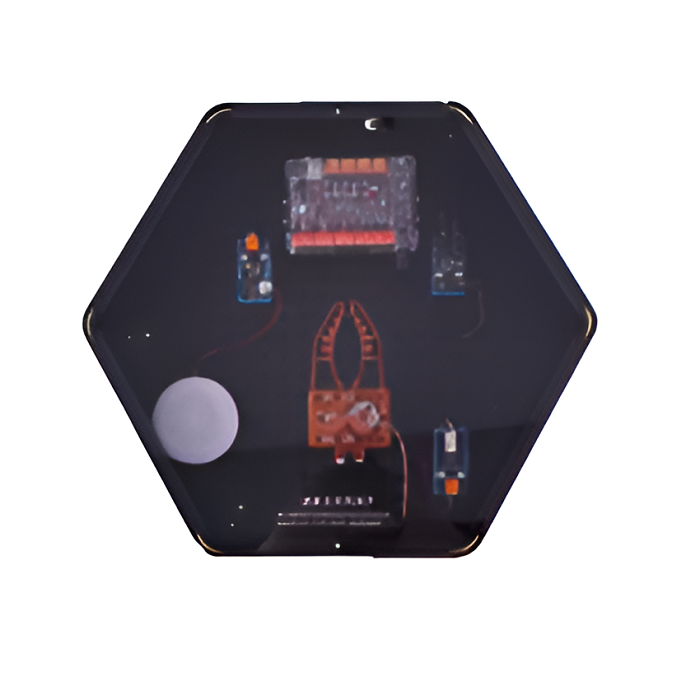 Интерактивный модуль для оформления зон рекреации, кабинетов, IT-полигона, библиотеки, медиа зоны. Модуль представляет собой математическую головоломку, состоящую из трех столбов и ряда дисков разных размеров. Изначально все диски сложены на столбе в порядке от большего к меньшему. Цель — переместить все диски с начального столба на другой, сохраняя порядок размеров неизменным во время перемещения. Модуль выполнен в форме шестиугольной призмы с интерактивным наполнением.