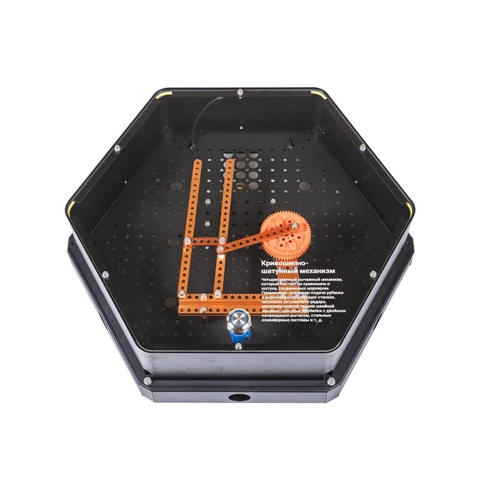 Интерактивный модуль для оформления зон рекреации, кабинетов, IT-полигона, библиотеки, медиа зоны. Модуль демонстрирует работу кривошипно-шатунного механизма. Выполнен в форме шестиугольной призмы с интерактивным наполнением.