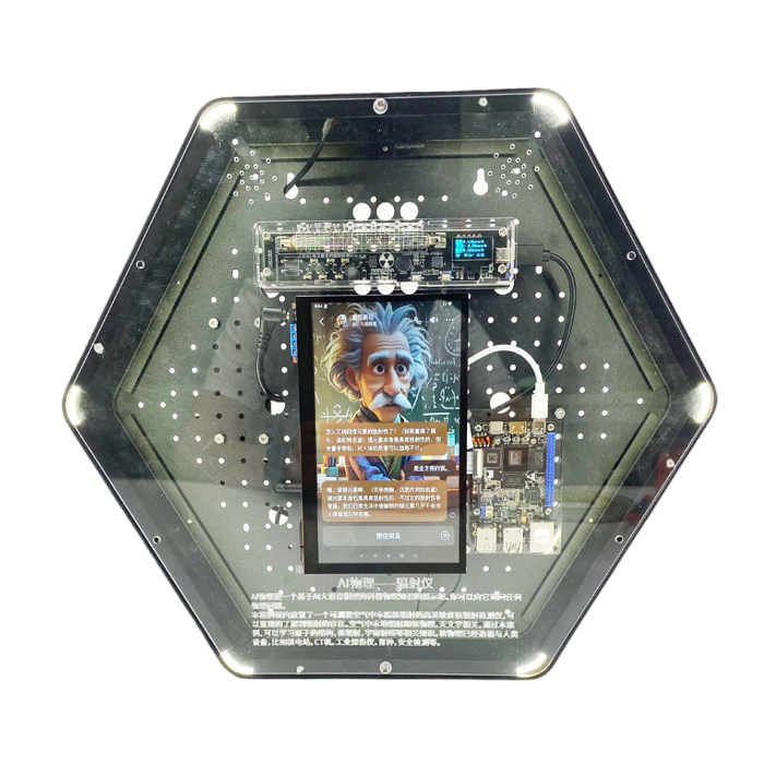Интерактивный модуль для оформления зон рекреации, кабинетов, IT-полигона, библиотеки, медиа зоны. Модуль позволяет изучить технологию ИИ, который поддерживает голосовой и текстовый ввод. Модуль позволяет расширить знания об ИИ, принципы работы машинного обучения, алгоритмы, технологии сбора и вывода данных. С помощью модуля можно узнать о структуре атомов, ядерном излучении, космических лучах и других знаниях в области физики. Модуль выполнен в форме шестиугольной призмы с интерактивным наполнением.
