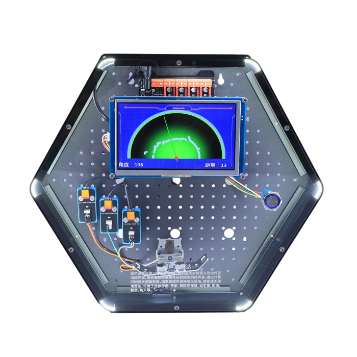 Интерактивный модуль для оформления зон рекреации, кабинетов, IT-полигона, библиотеки, медиа зоны. Модуль показывает принцип работы ультразвукового радара с помощью, которого можно изучить распространение и отражение звуковых волн в соотношение времени и расстояния. Модуль выполнен в форме шестиугольной призмы с интерактивным наполнением.