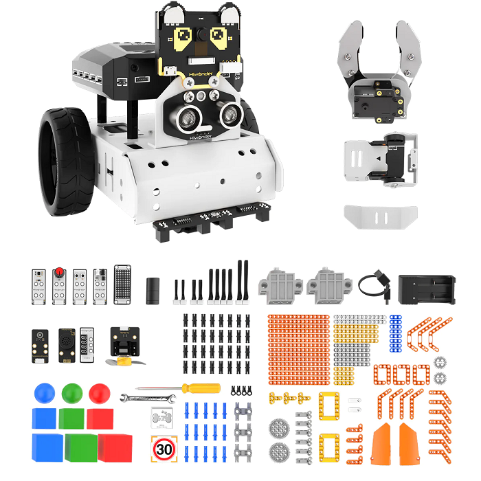 Обучающий робот нового поколения в области технологий искусственного интеллекта, основанный на графической языке программировании и языке Python. Оснащенный контроллером CoreX, двигателями с энкодером, 4-канальным отслеживанием линии и светящимся ультразвуковым датчиком, он может выполнять следование по линии, избегать препятствий и т. д. Стандартная версия, интегрированная с модулем машинного зрения WonderCam, доступна для составления алгоритмов с искусственным интеллектом, таких как автономное вождение, Vision Line Follow. , отслеживание тегов и т. д.