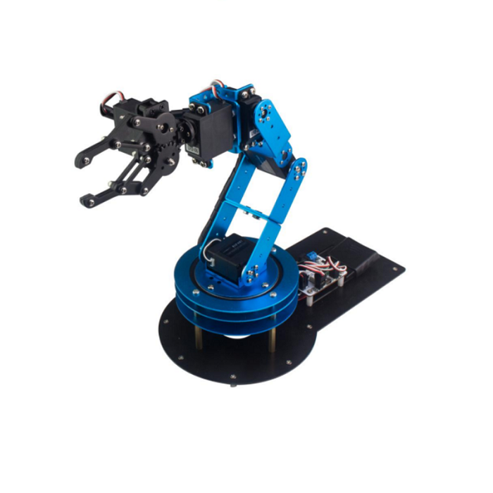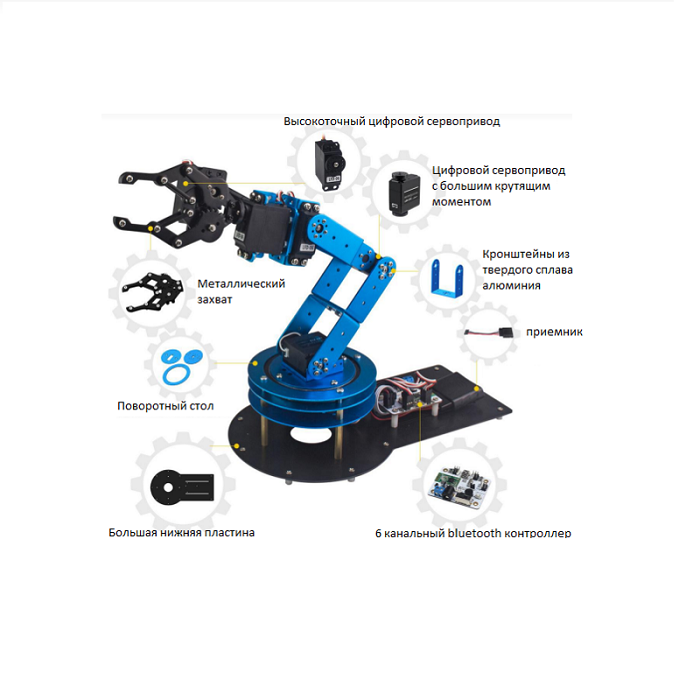 Роботизированный манипулятор с 6 степенями свободы. Детали выполнены из прочного алюминиевого сплава. В комплекте есть джойстик и устройство захвата. Набор подойдет для  одновременной работы одного-двух учеников в возрасте от 12 лет.
