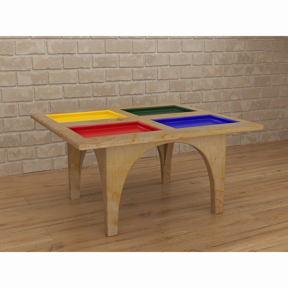 Игровой стол для занятий сенсорной интеграцией 4 цвета имеет лаконичный дизайн – основание имеет натуральный цвет древесины, а игровые пространства-углубления окрашены каждое в свой цвет (красный, жёлтый, синий и зелёный). Благодаря высокому полезному потенциалу детский игровой стол можно считать необходимым элементом оснащения пространства для занятий с детьми – его внешний вид и разнообразное применение поможет превратить обычное занятие в весёлую игру. Для чего нужно: игровой стол для занятий сенсорной интеграцией предназначен для групповых и индивидуальных занятий с детьми дошкольного и младшего школьного возраста в детских садах и центрах раннего развития.