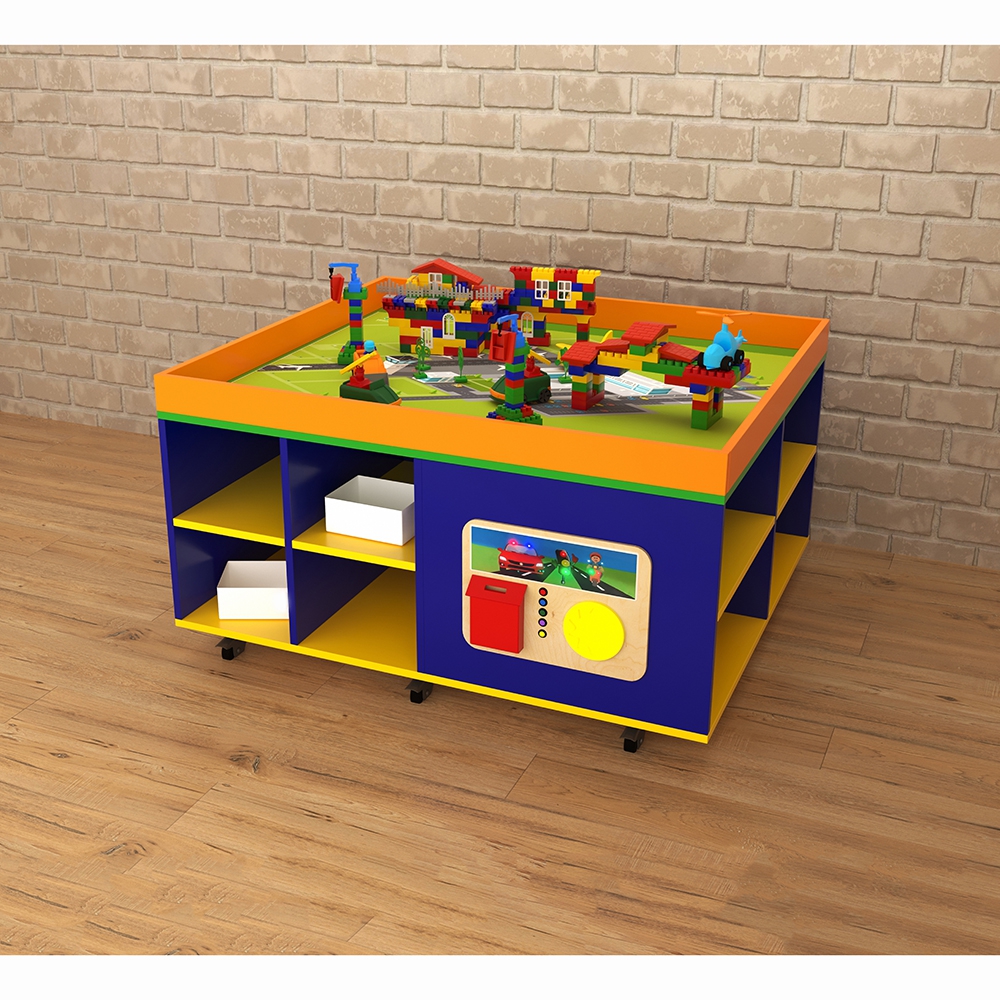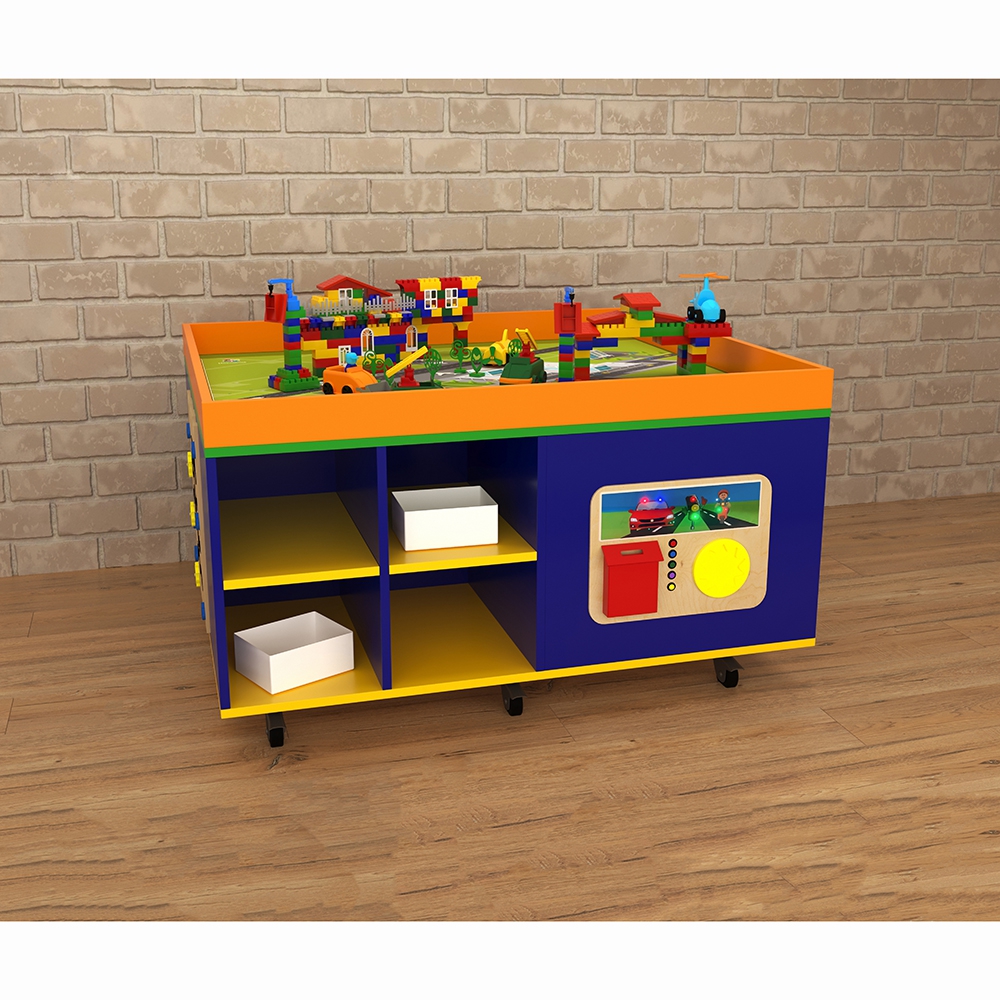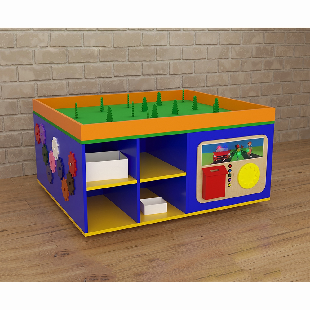 STEAM-столы имеют немалую область применения, используются дошкольными педагогами и некоторыми узкими детскими специалистами – логопед, дефектолог. За счёт наличия полок-ячеек и расположенных на боках стола тактильных развивающих элементов и прочих приспособлений для раннего детского развития, а также столешницы с широким потенциалом использования ландшафтный стол можно считать уникальным и необходимым элементом оснащения пространства для занятий с детьми. Стол “Лес” выполнен из древесины, основание и столешница окрашены в разнообразные яркие цвета, имеются и полки для хранения контейнеров с играми для раннего развития.