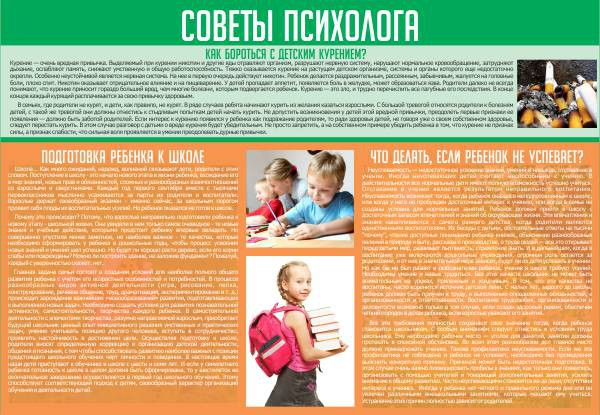 Очень полезный стенд «советы психолога» поможет в трудностях с ребенком, как родителям, так и учителям. Такой стенд необходимо повесить в холле или даже в каждом коридоре школы. На стенде размещена информация о вреде курения, чтобы школьники понимали, как это вредно и описано для здоровья и жизни. Так же учителя и родители могут прочитать информацию о том, что делать, если ребенок отстает по школьной программе. Одним из полезных разделов на стенде можно считать статью «подготовка ребенка к школе». Такие полезные советы от ведущих специалистов помогут наладить контакт с ребенком и объяснить ему, что и почему для него лучше.