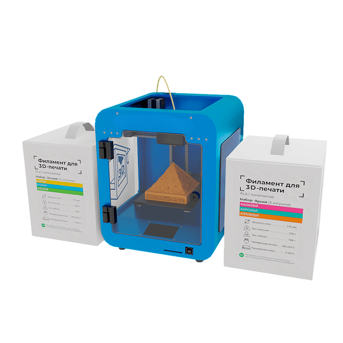В качестве рабочего материала используется PLA и PETG – безопасные для детей и простые в использовании материалы для печати.