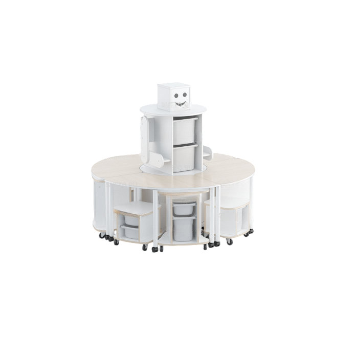 Главным преимуществом стеллажа «Робот-Робик» является его многофункциональность. Благодаря раздельным частям его можно трансформировать под любые нужды. Из нижней части собирается круглый стол, а посередине стоит Робик. Элементы конструкции также применимы в качестве отдельных тумб, которые можно разместить по углам. Наличие большого количества контейнеров позволяет сэкономить пространство и хранить необходимые материалы для занятий. «Робот-Робик» отлично подойдет для оформления игровых и развивающих зон.