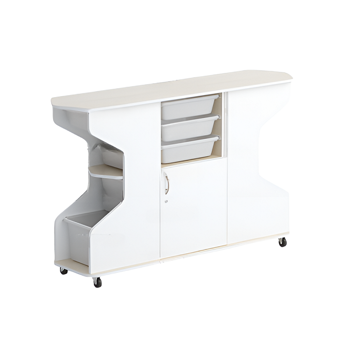 В средней части боковых секций закреплена фигурная полка, которая служит упором для столов на колёсиках: правого и левого.