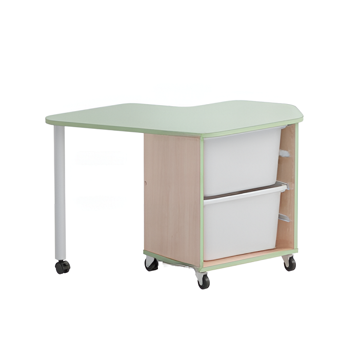 Стол детский левый Робик 002 выполнен из цветной ламинированной ДСП 16мм, кромки щитовых элементов облицованы кромочным пластиком толщиной 2 мм. Конструктивно стол выполнен в виде тумбы на колёсных опорах (две опоры с тормозом) и крышкой имеющей свес, поддерживаемый металлической опорой на колёсике. Внутри стола в открытой нише установлены два пластиковых лотка высотой по 230мм (длина лотка – 420 мм, ширина – 300 мм).