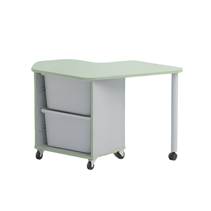Стол детский правый Робик 002 выполнен из цветной ламинированной ДСП 16мм, кромки щитовых элементов облицованы кромочным пластиком толщиной 2 мм. Конструктивно стол выполнен в виде тумбы на колёсных опорах (две опоры с тормозом) и крышкой имеющей свес, поддерживаемый металлической опорой на колёсике. Внутри стола в открытой нише установлены два пластиковых лотка высотой по 230мм (длина лотка – 420 мм, ширина – 300 мм).