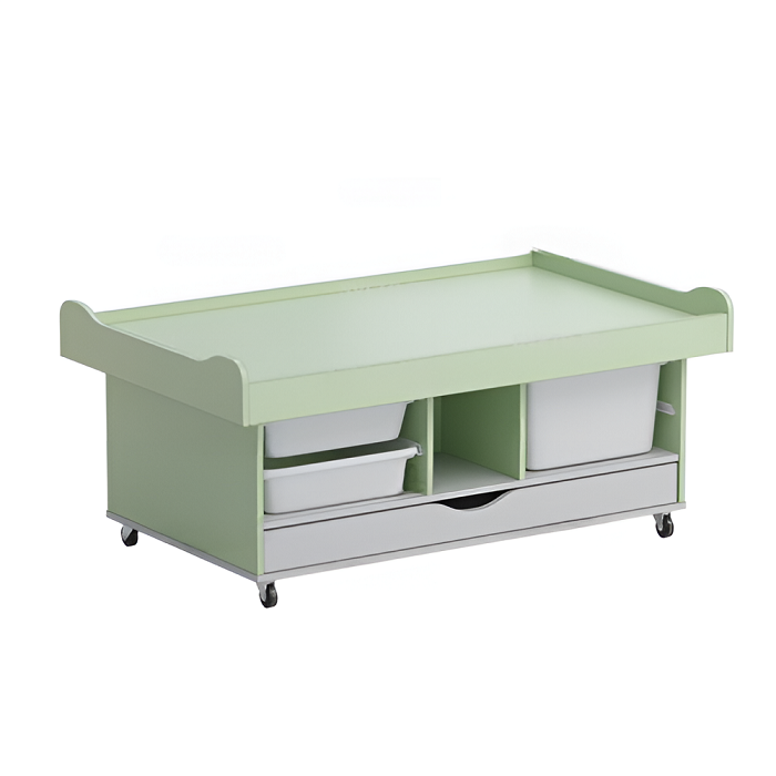 Стол для конструирования и робототехники выполнен из цветной ламинированной ДСП 16мм. Кромки щитовых элементов облицованы кромочным пластиком толщиной 2 мм. Конструкция стола включает в себя: крышку, основание, стенку горизонтальную, стойку среднюю, две боковины и четыре вертикальных стенки. В нижней части стола между основанием и стенкой горизонтальной на направляющих полного выдвижения установлен широкий ящик.