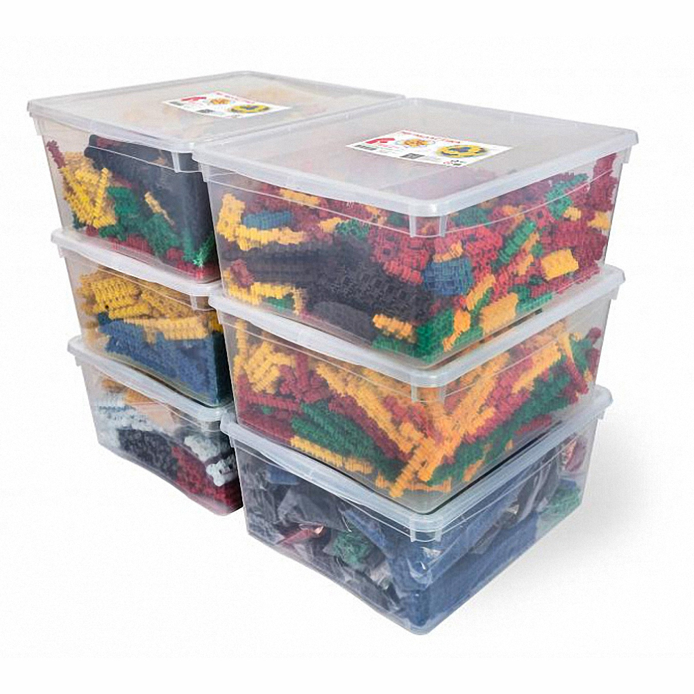 В набор «Мегакластика» входят все типы базовых деталей (12 разных) восьми цветов, а так же защелки и переходники, колеса и детали для подвижных соединений. Набор состоит из 6 пластиковых контейнеров. Детали подобраны в оптимальной пропорции. Набор рассчитан примерно на 10-12 учащихся.