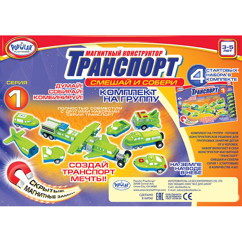 Набор включает в себя Магнитный конструктор Транспорт "Смешай и собери" серия 1 (стартовый набор) в количестве 4 шт.