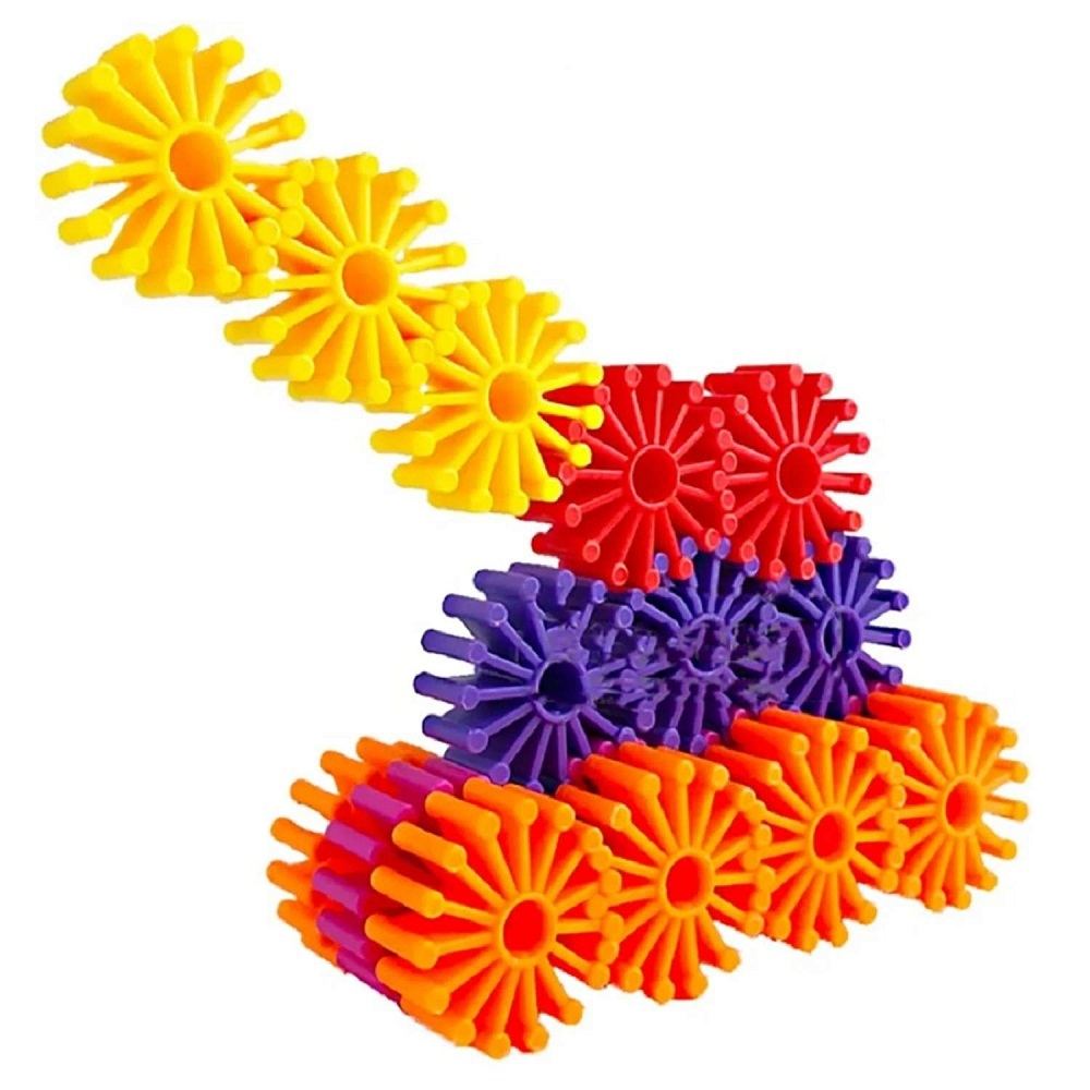 Все детали данного конструктора представляют собой круглые разноцветные фигуры с 15 лучами. В середине каждого «солнышка»– вытянутое горлышко, которое является местом скрепления одного элемента с другим. Из этого оригинального конструктора можно смастерить танк, бабочку и всё, что придумает богатая фантазия! Полученная конструкция приобретает за счёт лучей рифленую поверхность, что очень необычно выглядит и приятно на ощупь детским пальчикам. Набор позволяет развить сенсорное восприятие мира, художественный вкус, понимание цветовой палитры. При этом потребуется конструктивное мышление, чтобы сообразить, как смастерить из «солнышек» объёмную фигуру. Все детали безопасны для здоровья детей!