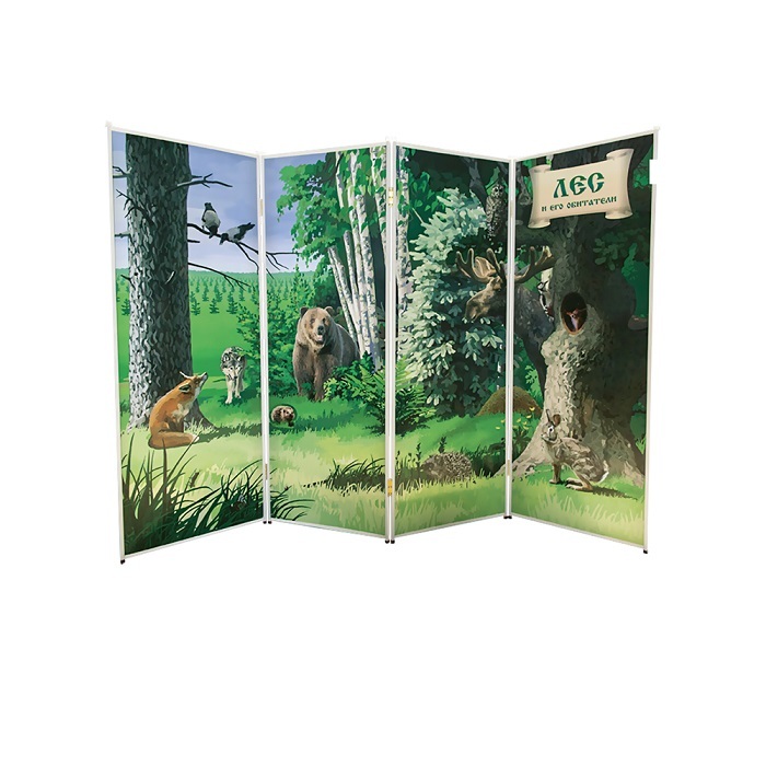 Дидактическая ширма представляет собой складную переносную перегородку, состоящую из четырех секций. Каждая сторона секций представляет собой полноцветное дидактическое панно с интегрированными рельефно-визуализационными элементами. На панно представлено природное сообщество (лес, луг, водоем).