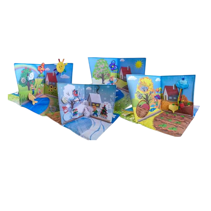 Разделена на 4 зоны: зима, весна, лето, осень. Все это дополнено навесными элементами (яблоко, солнышко, бабочка, цветы, птичка, грибы, овощи: капуста, морковь, свекла, картофель, игрушки: лопатка, ведерко с песком, тучка, утка, утята) для более интересной игры.