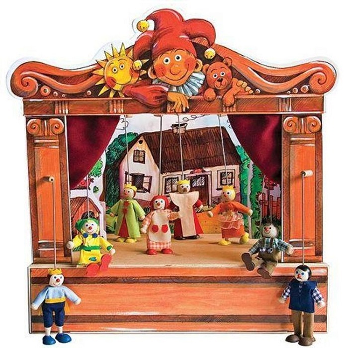 Картонный домашний кукольный театр. Театр кукол. Театр низовых кукол (кукол-марионеток), управляемых сверху с помощью ниток, прутов или проволоками. Театр содержит деревянную транспортировочную коробку, 8 деревянных марионеток, и декорации для 4 сцен. Марионетки очень простые для управления, что позволяет использовать их детьми от 4 лет. Театр марионеток готовый для представления. Театр кукол идеальный вариант для использования в семье, детском саду, школе или театральном кружке.