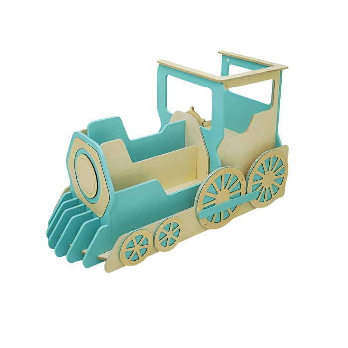Локомотив поезда – деревянный паровоз с вращающимся рулём и колёсами. Малышам очень нравится залезать внутрь и представлять себя бравым машинистом! Сидушка имеет откидную конструкцию, под ней небольшой отсек для хранения игрушек. Нос паровоза имеет полки-витрины для расстановки книг, раскрасок и коробок с пазлами.