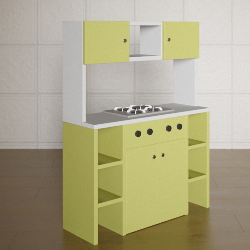 Фасад представленной кухни яркого и сочного салатового цвета, его отлично оттеняет белоснежная столешница и такого же цвета верхний ярус. Детская кухня «Алиса№1» имеет 2 рабочие зоны, благодаря чему за ней с удобством могут одновременно разместиться 2 девочки, абсолютно не стесняя друг друга. Изготовлена из высококачественных материалов, которые также безопасны в использовании.