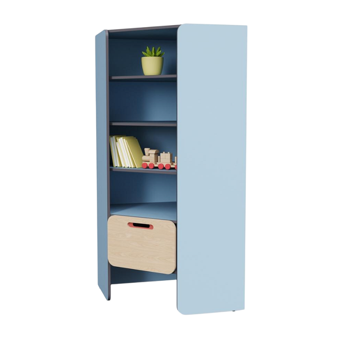 Угловой модуль для демонстрации детских работ. Оснащён глубокими полками для удобного размещения поделок воспитанников. Объединяет остальные модули из коллекции мебели «НЕГА» в единую композицию.