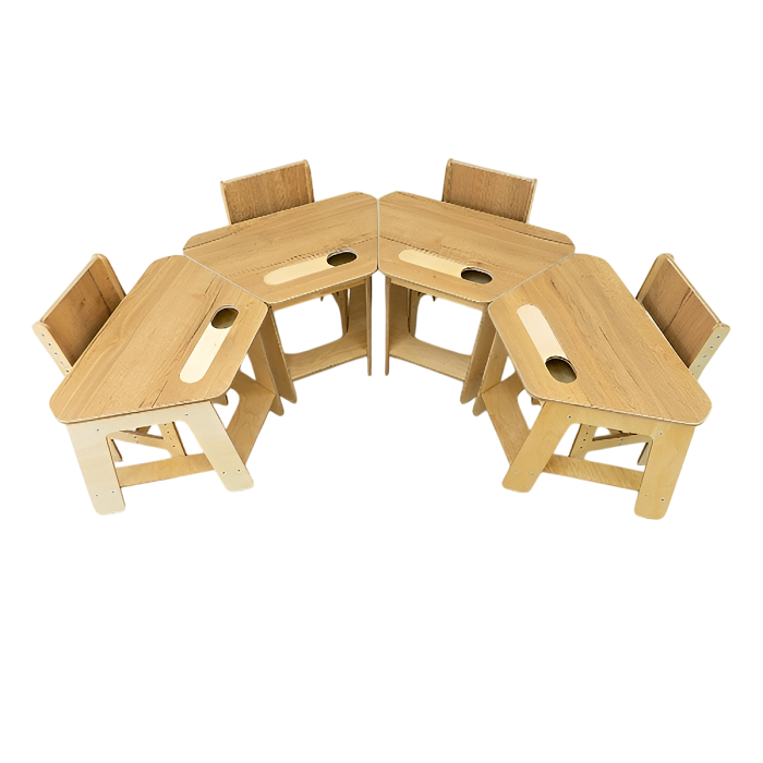 - «Детский стол» имеет форму трапеции. Необычный дизайн столешницы даёт возможность экспериментировать с расстановкой парт и позволяет максимально эффективно заполнять пространство в классе. Парты легко собираются в круг, линию или змейку, давая детям возможность взаимодействовать друг с другом. В столешнице предусмотрено отверстие под стаканчик с канцелярскими принадлежностями и полка для хранения мелочей, а снизу конструкции – опора для ног.