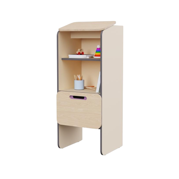Шкаф-конторка для записей с наклонной верхней столешницей служит для ведения журналов приёма и передачи детей, а также заполнения необходимых документов. Конструкция эргономична для анатомии взрослого человека, и воспитателю будет удобно делать записи. Предмет из коллекции мебели «НЕГА».