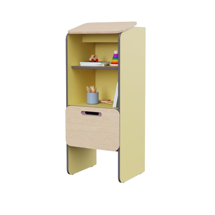 Шкаф-конторка для записей с наклонной верхней столешницей служит для ведения журналов приёма и передачи детей, а также заполнения необходимых документов. Конструкция эргономична для анатомии взрослого человека, и воспитателю будет удобно делать записи. Предмет из коллекции мебели «НЕГА».