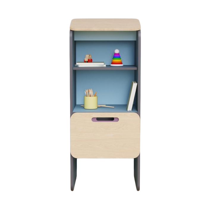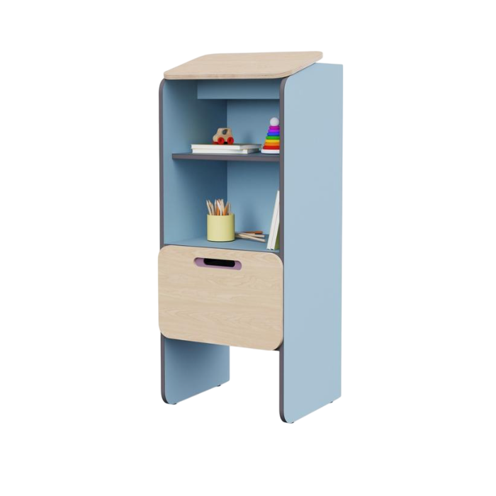Шкаф-конторка для записей с наклонной верхней столешницей служит для ведения журналов приёма и передачи детей, а также заполнения необходимых документов. Конструкция эргономична для анатомии взрослого человека, и воспитателю будет удобно делать записи. Предмет из коллекции мебели «НЕГА».