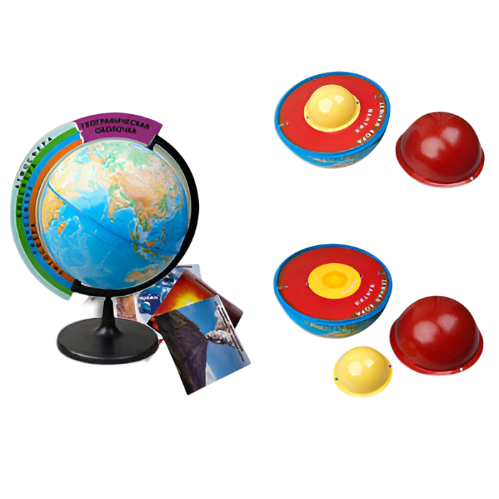 Дополнительно элементы внутреннего строения Земли представлены полусферами «Ядро» и «Мантия», согласованными по цвету с диском, на котором они фиксируются магнитами. Внутренняя поверхность полусферы «Северное полушарие» обозначает земную кору и также согласована по цвету с диском.
