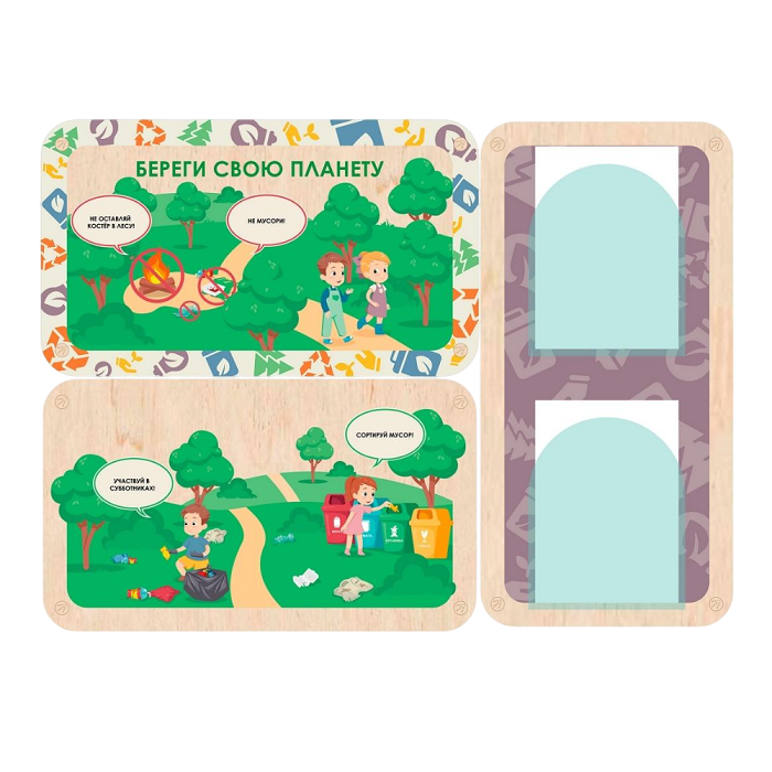 Информационный стенд для оформления стен в детских садах, начальной школе и организациях дополнительного образования. Красочные наглядные иллюстрации с простыми подписями помогут дошколятам понять правила экологичного поведения, даже если они ещё не умеют читать. Важная информация для родителей может размещаться в акриловых карманах около каждого стенда.