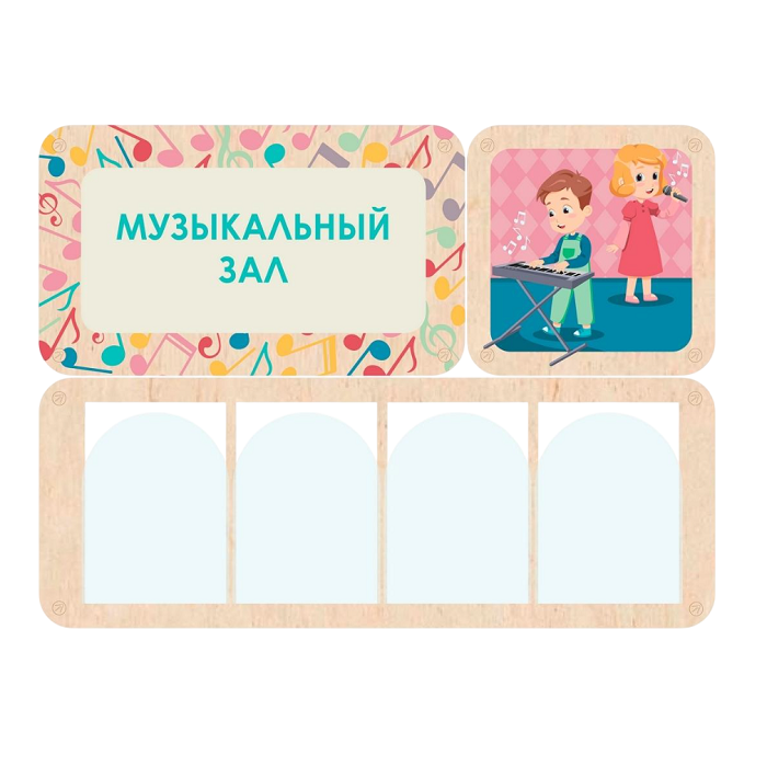 Стенд информации для детского сада, который рассказывает детям и родителям важные сведения о работе музыкально зала. В акриловых карманах можно разместить документацию, расписание занятий, правила и многое другое. Яркий заголовок акцентирует внимание посетителей на этой информации.