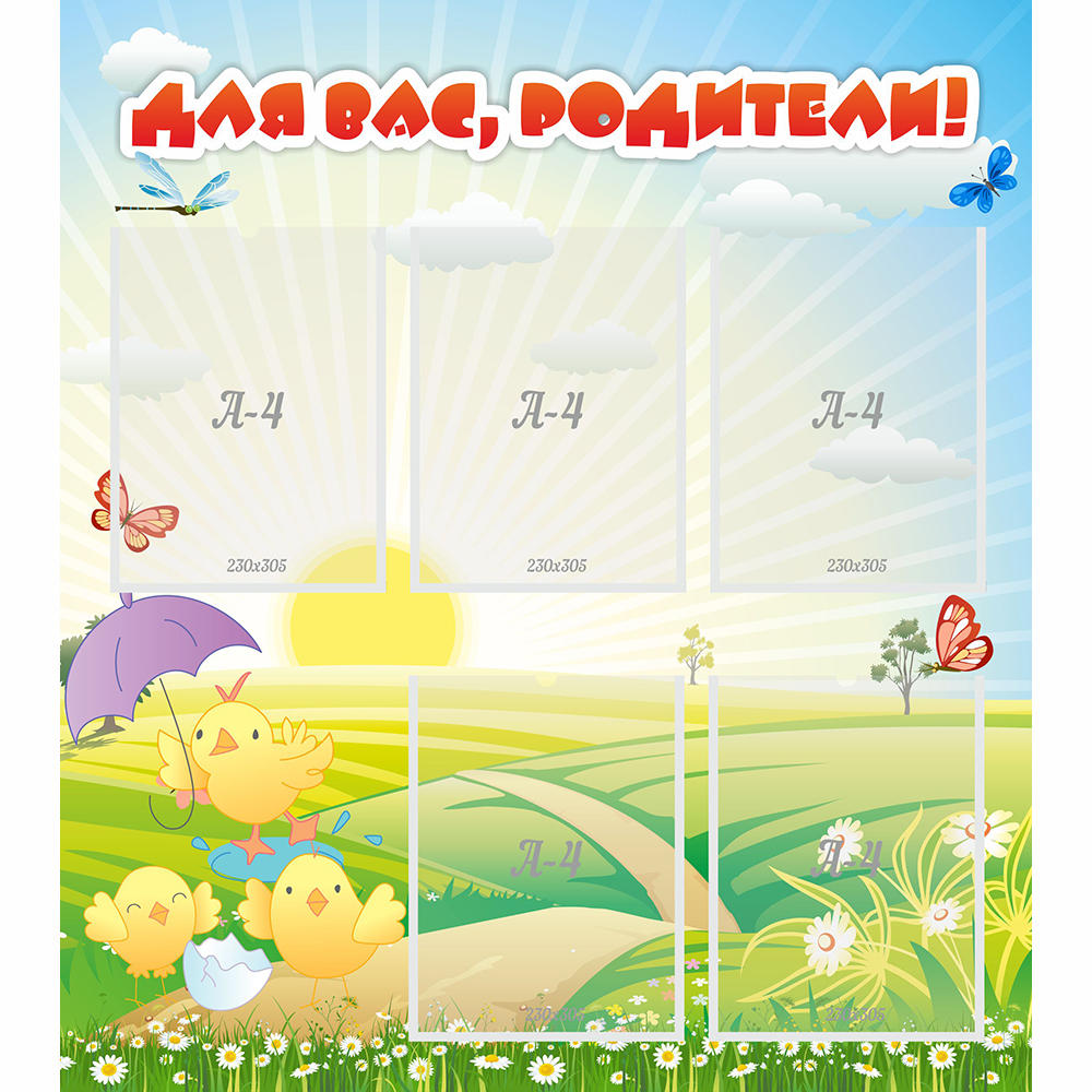 Информационный стенд для родителей с изображением забавных цыплят, имеет пять специальных карманов размером в стандартный лист А4, это прекрасная возможность донести необходимую информацию для родителей. Стенд удобный и практичный, его легко установить в любом помещении и на любой поверхности. Стоит отметить, что он сделан из высококачественного материала, со специальным защитным покрытием, что позволяет сохранить яркость цвета и рисунки максимально долго. Стенд станет гармоничным дополнением в общую атмосферу детского сада, а яркие картинки привлекают внимание детей и очень им нравятся.