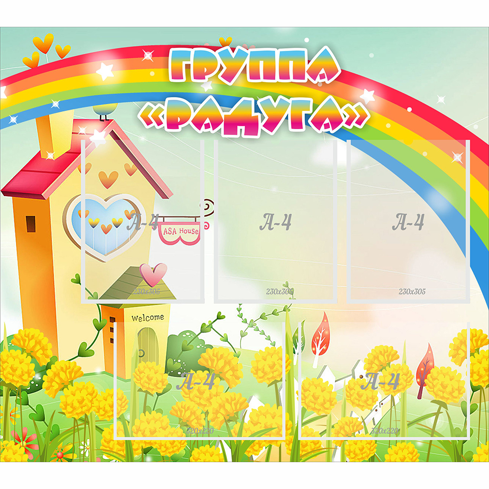 Для размещения необходимой информации служат пять прозрачных пластиковых карманов, расположенных так, чтобы не заслонять радугу и название стенда.