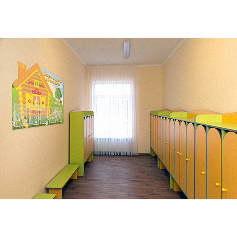 Дизайн стенда напоминает о летнем отдыхе в деревне. Тут и раскрашенный в яркие тёплые цвета деревянный домик, и порхающие над полевыми цветами бабочки и далёкая радуга. В шести специальных карманах можно размещать объявления, распорядок дня, меню в столовой, списки детей и многое другое.