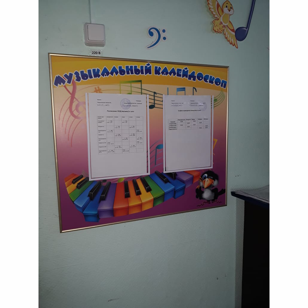 Хорошо, когда уроки музыки имеют какие-то специальные наглядные пособия. Так детям интереснее заниматься, и усваивать материал. Отличным решением для этого может стать представленный стенд, который сделан из качественного материала.  Интересное внешнее оформление дарит прекрасную возможность привлечь детское внимание. Оснащен двумя карманами формата А4, в которых можно размещать слова песен, нотный стан, плакаты и объявления для малышей и их родителей. При необходимости все размещенные листы легко заменяются на новые.