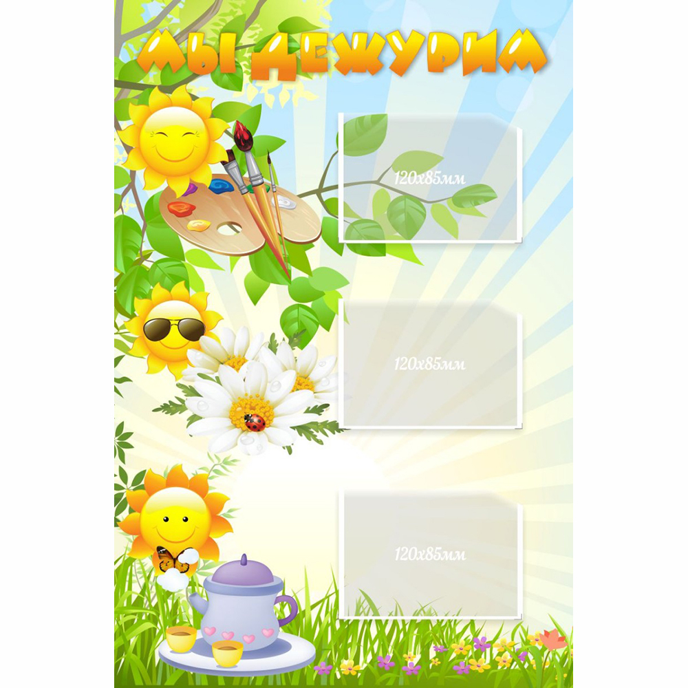 Маленькие Солнышки на фоне ярких солнечных лучей заняты важными и срочными делами. Такое оформление стенда обязательно привлечёт внимание детей. В карманах формата А5 можно помещать фото и имена ребят, которые дежурят в столовой, на занятиях и в уголке природы. Размещенная информация при необходимости легко обновляется. Соблюдение графика дежурств учит детей быть дисциплинированными и ответственными.