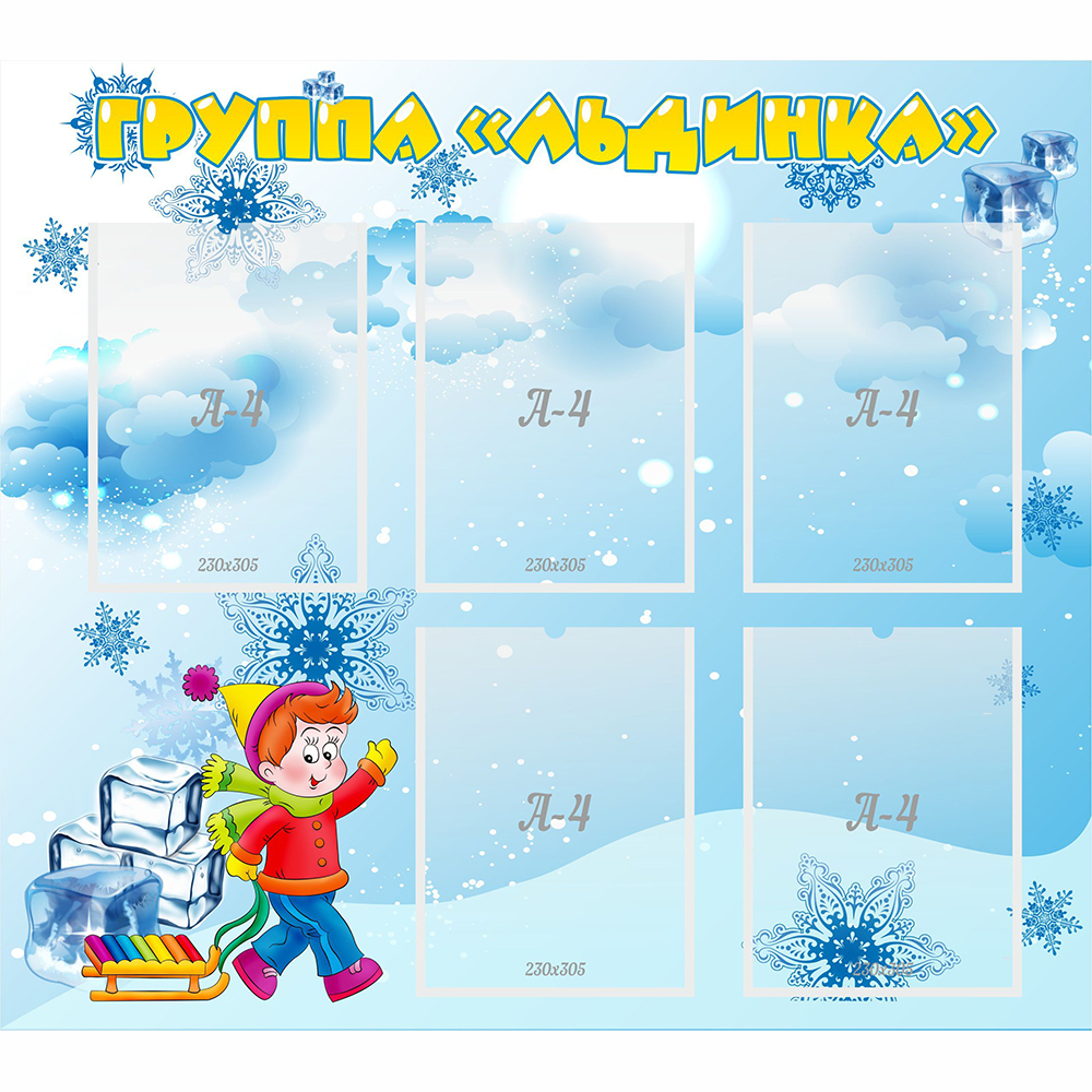 Дизайн стенда выполнен в зимних мотивах: сугробы, снеговые тучи, кубики льда. И на этом фоне невероятно красивые фигурные снежинки. Но зима не пугает мальчика с расписными санками.
