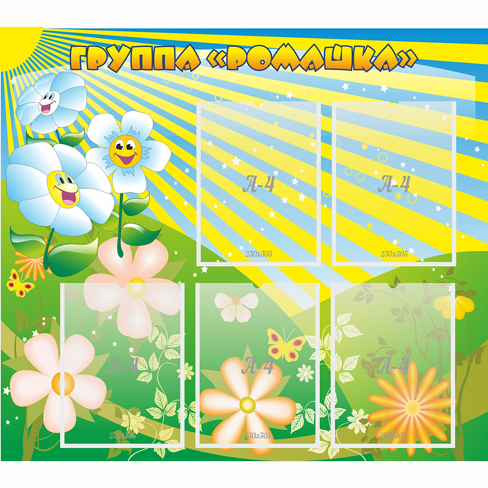 Яркие ромашки всегда будут радовать малышей, даже когда за окошком будет лежать снег. Желтое солнце согреет своими лучами. Отличительной особенностью этого стенда является его яркий и необычный дизайн. Название стенда выполнено в желтом цвете. Основной элемент дизайна – белые ромашки.