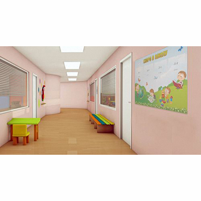 Стенд очень яркий, информационные карманы располагаются под заголовком в верхней части стенда. Заголовок лаконичный, выполненный в градиенте желтого цвета. На поляне играют, веселятся и учатся веселые дети. Им в этом помогают глобус, букварь, краски с карандашами. В нижней части стенда растут красивые ромашки, а в небе летают бабочки и стрекоза.