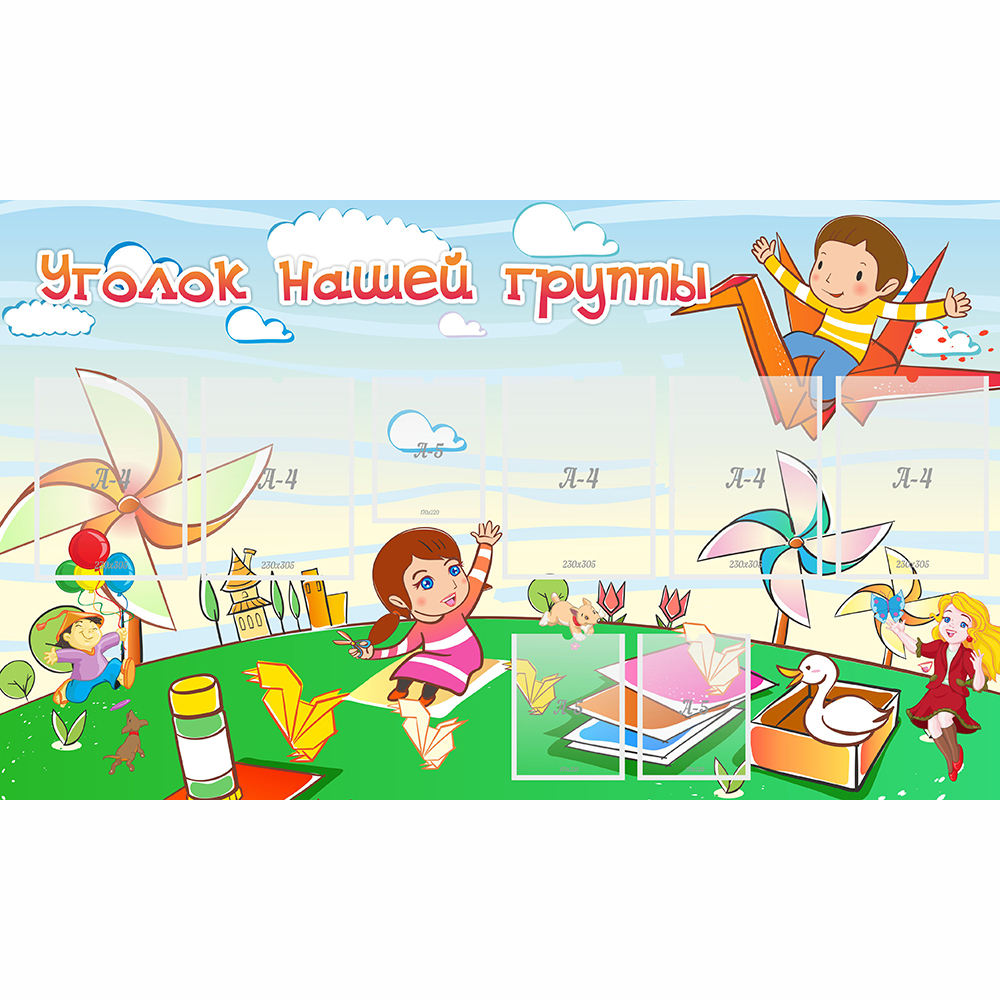 Информационный стенд «Уголок нашей группы» станет отличным местом для размещения важной информации, касающейся группы детского сада, ее маленьких участников и воспитателя. В специальных карманах можно размещать фотографии, рисунки, плакаты, важные объявления, распорядок дня и прочие информационные материалы для детей и их родителей.