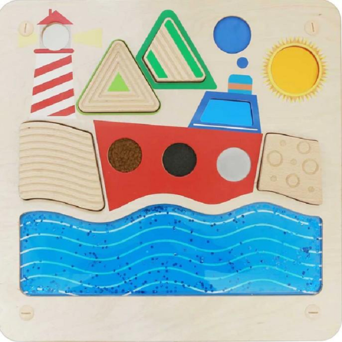 Настенная панель выполнена из березовой фанеры. На лицевой части панели зафиксированы деревянные блоки с выгравированными линиями и окошки с образцами различных текстур и материалов для тренировки тактильных и сенсорных навыков.
