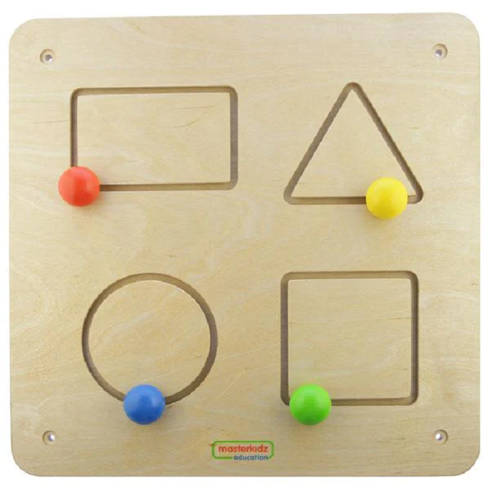 Панель выполнена из березовой фанеры. Размер 460*460 мм. На лицевой поверхности панели выполнены прорези в виде геометрических фигур (квадрат, треугольник, круг, четырехугольник) и в них подвижно закреплены 4 разноцветных шарика. По углам панели размещены отверстия для крепления панели к стене.
