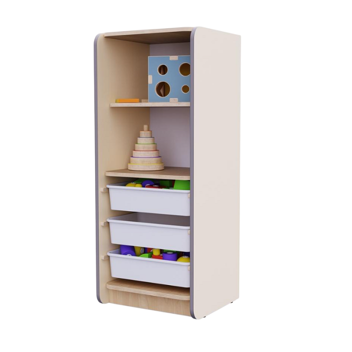 Открытый шкаф с двумя полками и тремя пластиковыми ящиками для оснащения игровых комнат в детских садах и организациях дополнительного образования. Этот открытый шкаф удобен и функционален, с ним легко создать систематизированное хранение и атмосферу порядка в ДОУ.
