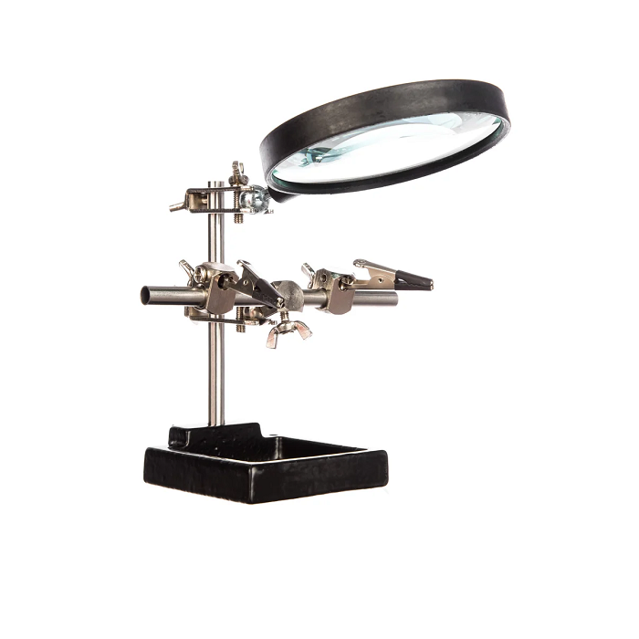 Держатель «третья рука» с лупой служит главным образом при проведении паяльно-сборочных работ в электронике, ювелирном деле, сборке и ремонте для зажима мелких деталей в любом нужном положении, когда не хватает двух рук.