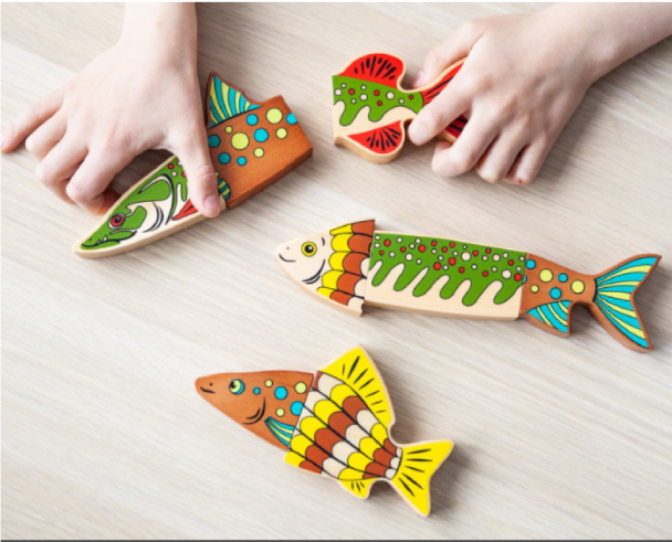 - Разомкните рыбок на составные части и разложите вперемешку. Задача ребенка соединить части таким образом, чтобы рисунок на рыбках совпадал.