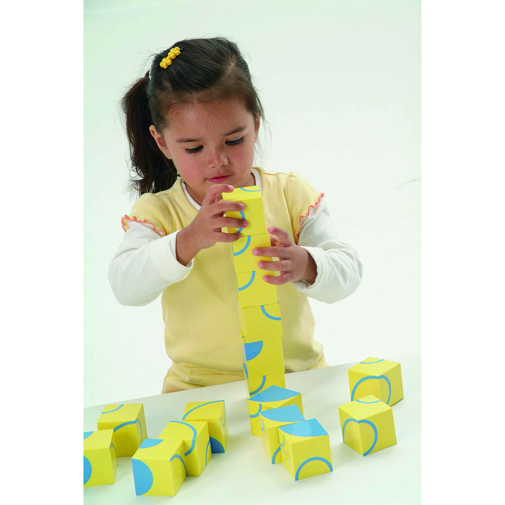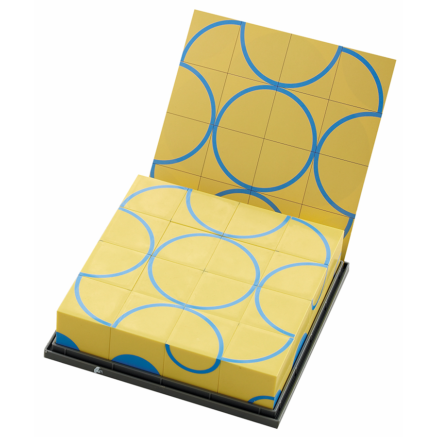 Грани кубика имеют 6 вариантов окраски (на желтом фоне синие сектора и дуги): большая и маленькая четверть круга, половинка круга; большая и маленькая четверть окружности, половинка окружности