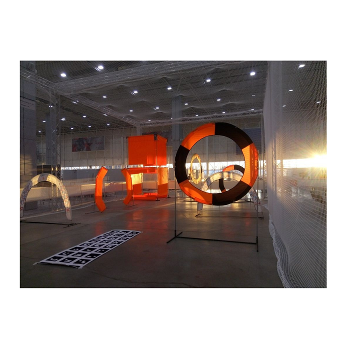 Трасса для проведения соревнований по дрон-рейсингу, включающая в себя поворотные флаги, курсовые ворота, площадку для взлета-посадки, подвесные кольца, систему автоматической фиксации пролетов.