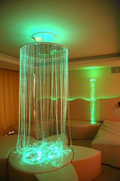 Светильник устанавливают в центре сенсорной комнаты. Равномерно распределенный по окружности каскад нитей создает эффект ниспадающей воды.