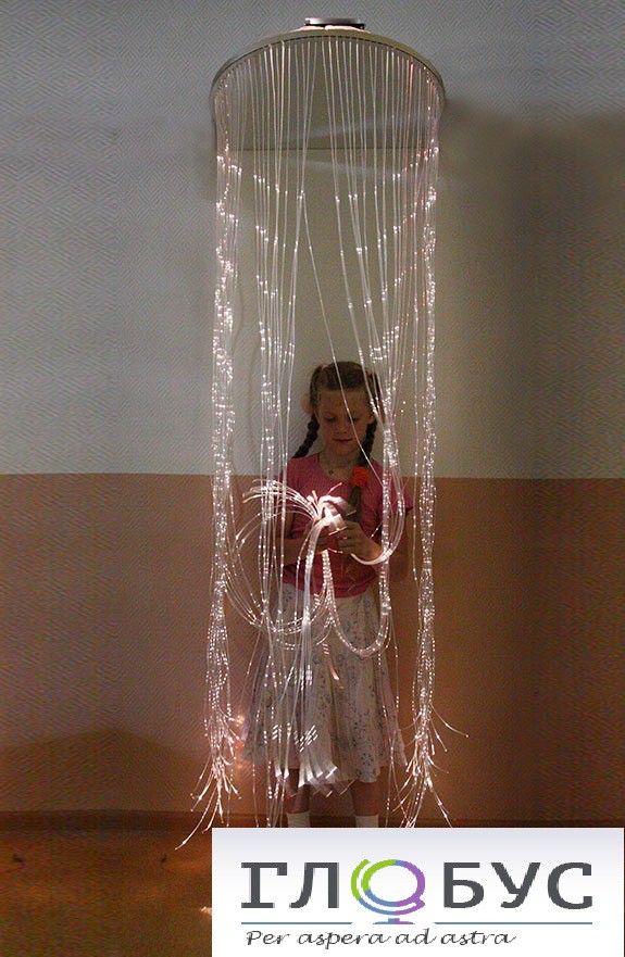 Несущая настенная конструкция выполнена в виде козырька домика, с которого свисают светящиеся фибероптические нити. В домик можно зайти и спрятаться от окружающего пространства. Крепление настенное. Количество нитей: 60.